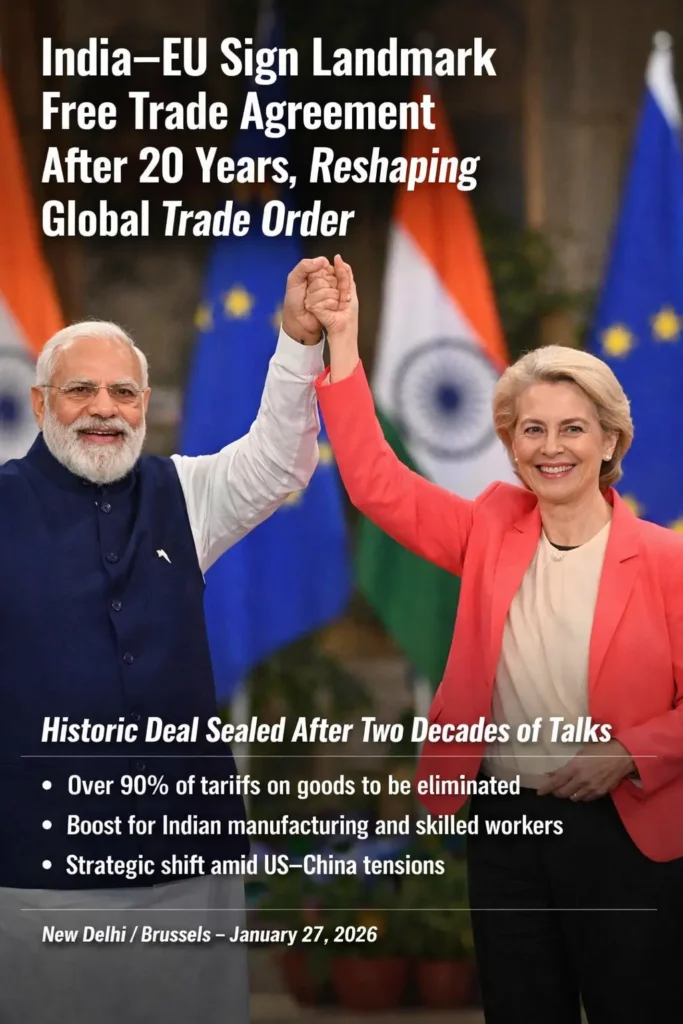 India and the European Union have sealed a historic Free Trade Agreement (FTA) after nearly two decades of negotiations, marking one of the most consequential global trade deals of the decade. Prime Minister Narendra Modi and European Commission President Ursula von der Leyen formally announced the agreement at the India–EU Summit, calling it the “mother of all trade deals” and a turning point in economic and geopolitical cooperation.